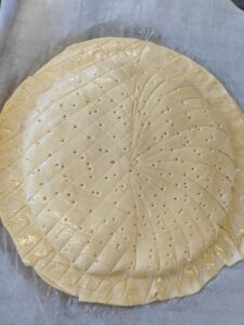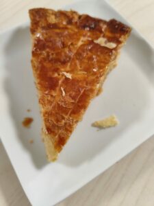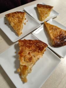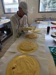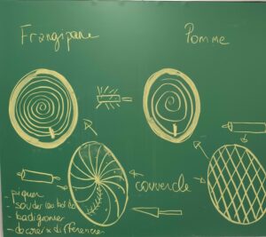 En enseignement adapté c’est une affaire d’équipe: les 4e I option HAS confectionnent la compote et la crème pâtissière, les CAP confectionnent la frangipane et fabriquent la galette. Tout une mise en scène : dorure, assemblage, fourrage, introduction de la fève, soudure, décor pour différencier la pomme de la frangipane, cuisson et sirop pour la faire briller !