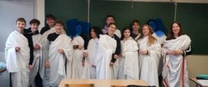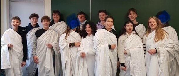 Après avoir étudié, avec Mme Osselin, le discours prononcé par Cicéron contre Catilina, les élèves latinistes de la classe ont appris le texte en question afin de le déclamer, vêtus de toge romaine.